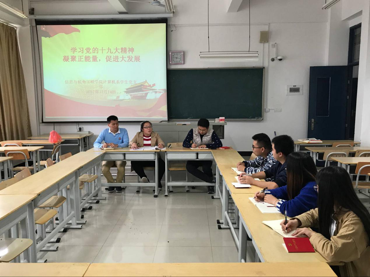 2017年11月14日,信息与pa娱乐游戏计算机系员工党支部在DB403召开全体党员大会,开展了学习党的十九大精神“凝聚正能量,促进大发展”的主题党日活动。党员们一致认为:深入学习宣传贯彻党的十九大精神,是当前和今后一个时期首要政治任务。同时,必须加强党对意识形态工作的领导,牢牢把握意识形态领域话语权和主动权。要旗帜鲜明讲政治,身体力行作表率,严格落实意识形态工作责任制,切实加强阵地建设和管理,对错误思潮、言论、观点正面回击,使校园主旋律更加响亮,正能量更加强劲,教育引导广大师生坚定理想信念,志存高远,脚踏实地,锐意进取,勤于学习,埋头苦干。