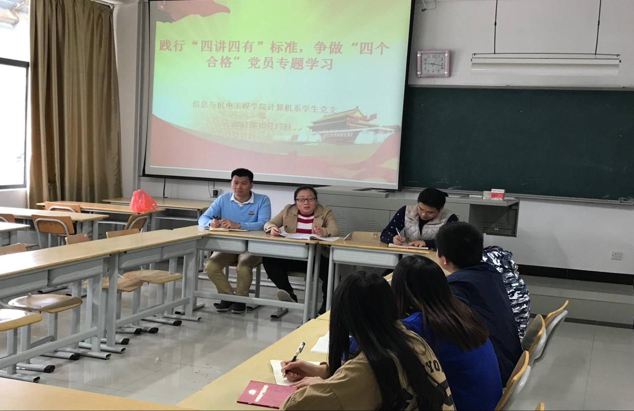2017年10月17日,信息与pa娱乐游戏计算机系员工党支部在DB407召开全体党员大会,践行“四讲四有”标准,争做“合格党员”主题党日活动。“四讲四有”高度概括了新时期合格共产党员应该具备的政治要求、道德要求、纪律要求、行为要求,是具有深刻内在联系的辩证统一体。践行“四讲四有”合格党员标准,每个党员要把自身思想政治建设放在首位,解决自身存在的理想信念模糊、党的意识淡化、党员宗旨淡薄的问题。通过学习,全体党员领会了精神实质、学会科学方法、解决现实问题,最终实现从学入思、从思导行,做思想建党的引领者。同时,“四讲四有”是我们党对党员提出的新要求,是规范和衡量每个党员是否合格的基本尺度,是新时期广大党员以知促行、知行合一的行动指南。