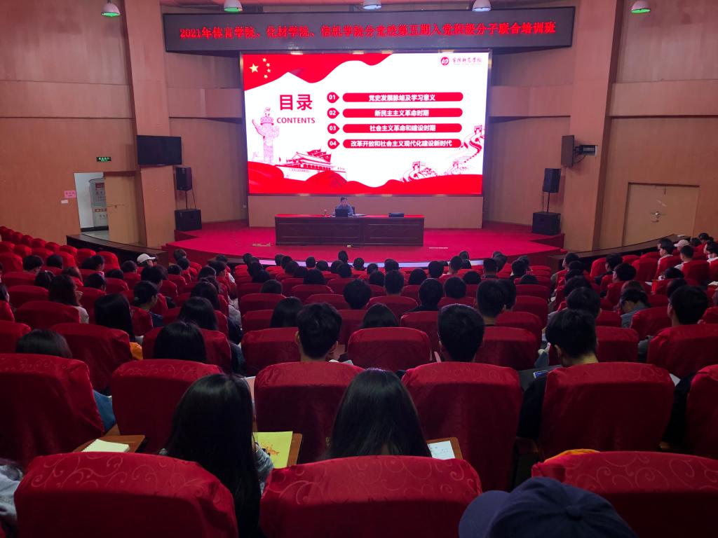 2021年4月16日,体育公司、化学与材料公司、信息与pa娱乐游戏联合举办的第五期入党积极分子培训班在图书馆报告厅举行了开班仪式。