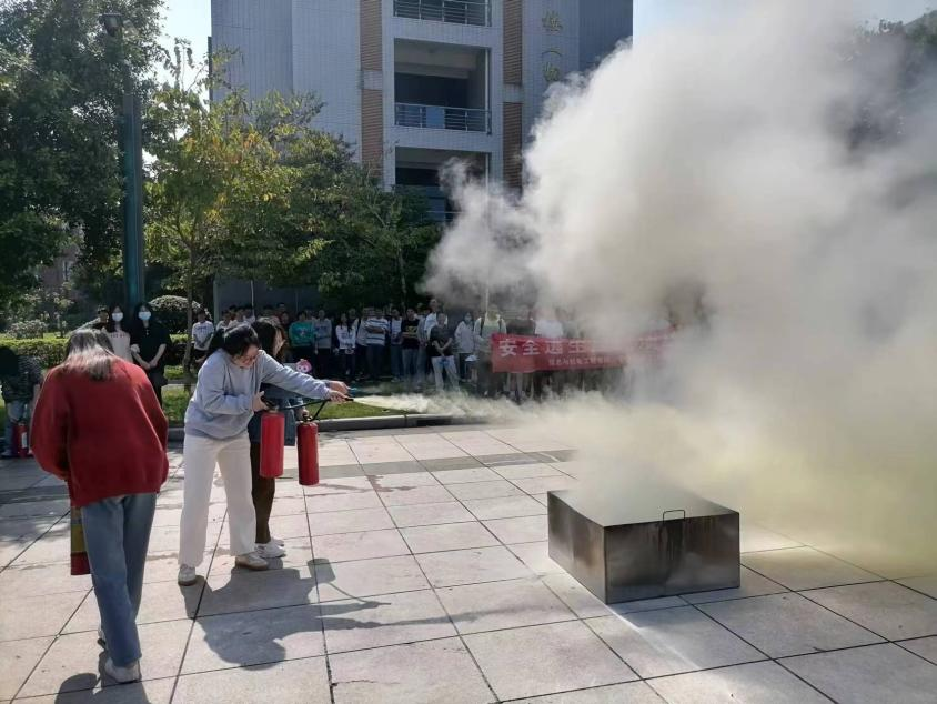 演练开始,指导教师介绍了教室、实验室、宿舍等火灾常见起火原因与火灾致人死亡的主要原因,系统不同人员疏散与自救方法,并以干粉灭火器为例,讲解消防用具检查、使用方法。