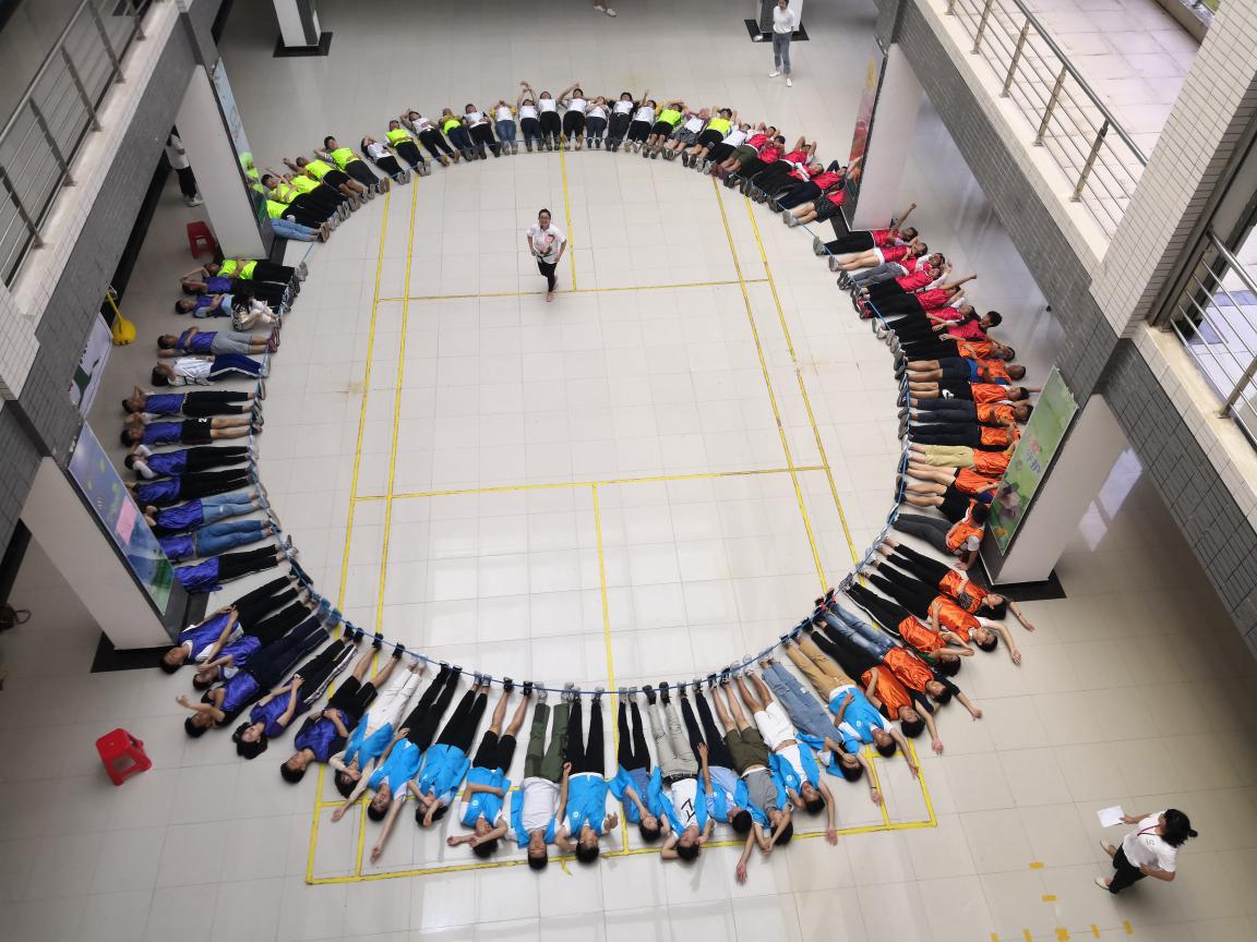 欧嘉烟老师先介绍本次团体辅导的目的与意义,并将八十多名员工分组成六个团队以便开展活动。在热身环节中,各队的每位成员通过“滚雪球”游戏,向大家介绍自己的年级、班级、姓名,要求其他人要在规定的时间内记住全体队员的信息,老师随机选择一位同学考核,速度最快且全部答对者获胜,这个活动促使大家讯速熟识起来,为后面开展活动奠定了基础。在正式活动环节中,首先,进行团队建设,要求每个团队确定队名、队歌、口号,并展示自己的风采;其次,通过“人椅”活动和“超级链接”活动锻炼大家的团队合作、协调能力;“我们都是一家人”活动,让每队人员都自行围成一圈,说出一个字拍前面的人肩一下,然后左手拍右手一下,以此类推,为的是让大家放松身心;在“动力圈”活动中所有人紧紧拉着绳索,每队出两位成员参与比赛,一位在绳索中行走,一位搀扶着保证安全,用时最短的组获胜,这项活动加强了同学们间的信任;最后,分享心语心愿,每位参与者分享心得,并在成长树上写下自己的愿望,活动结束之际成员之间互相给予祝福。