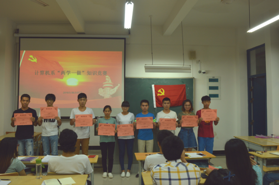 为了全面贯彻党的十八大精神,深入学习贯彻党章和习近平总书记系列重要讲话精神,推动“两学一做”学习教育重点工作,进一步加强基层党组织和党员队伍建设,提升员工党员、积极分子的整体素质,2016年06月07日,计算机系员工党支部在DB405举办“两学一做”知识竞赛。竞赛以班级为单位将员工分为11组,竞赛的内容涉及到党章、习近平总书记系列讲话内容、党史、《细则》、《条例》等。经过激烈角逐,2013级计科(师范)班代表队荣获一等奖;2014级计科(师范)班代表队和2013级计科(非师)班代表队荣获二等奖;2014级计科(非师)班代表队、2015计科(师范)班代表队、2015级计科(专升本)班代表队荣获三等奖。 此次活动让全体员工党员、积极分子接受了一次红色文化的熏陶,达到了推动开展“两学一做”学习教育的预期目标。