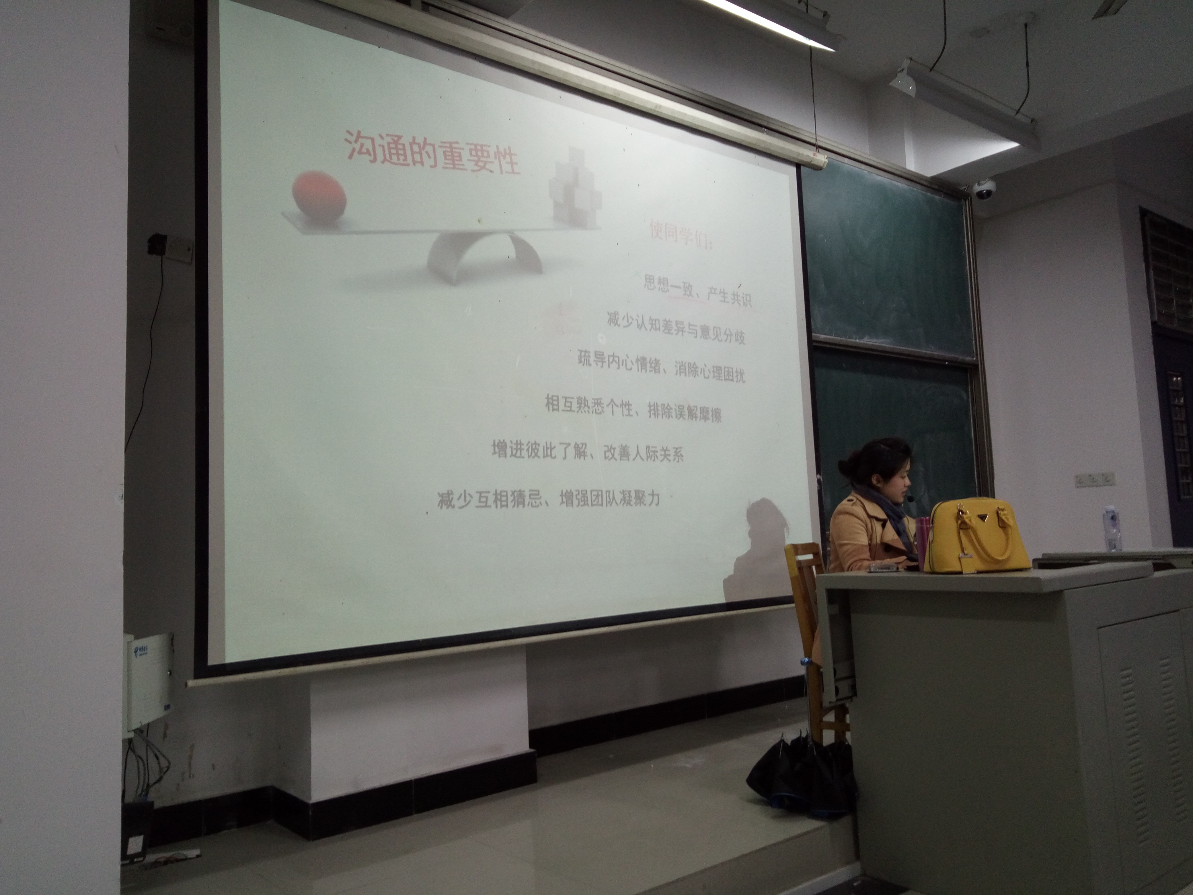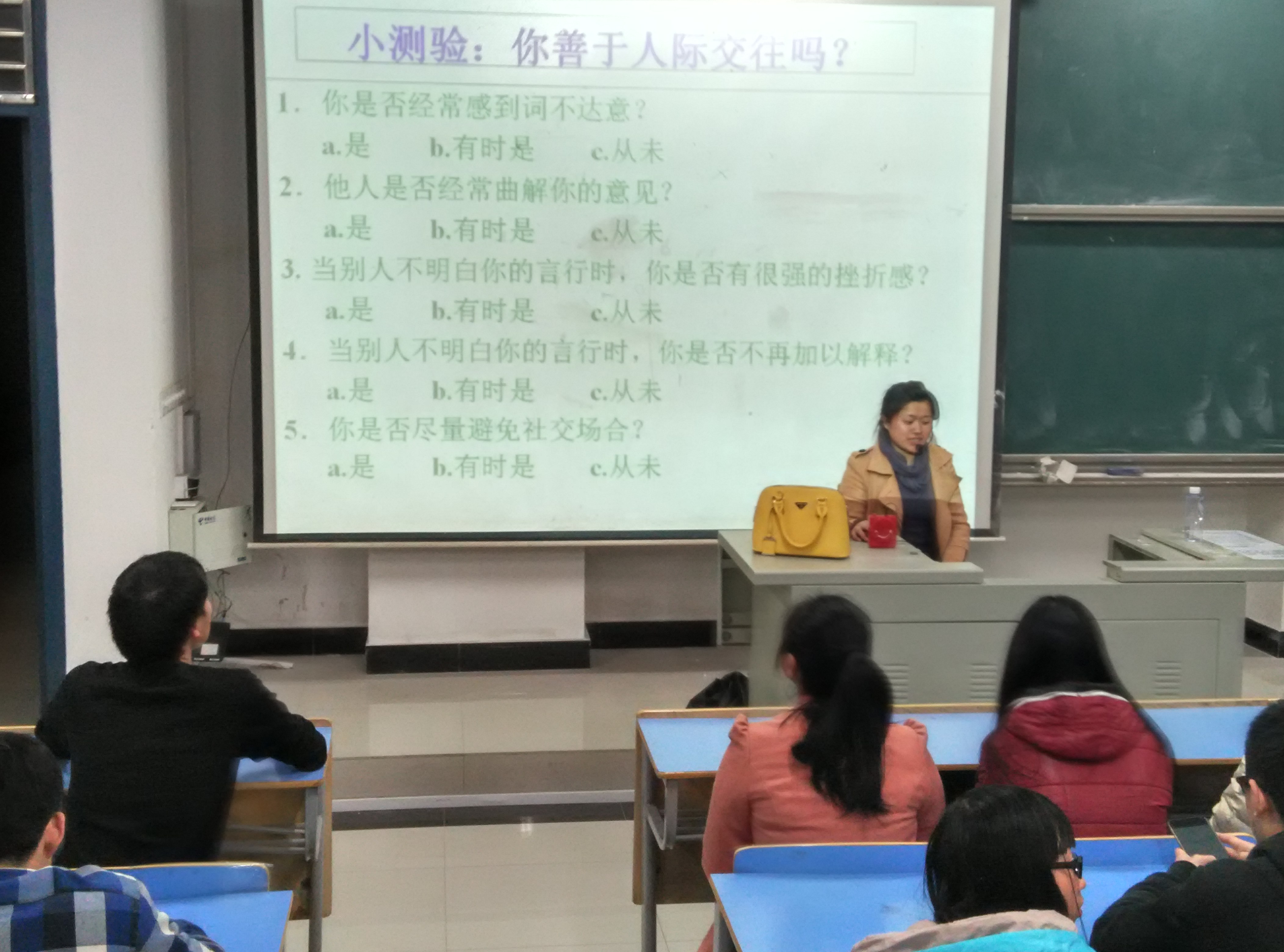 计算机系历来高度关注员工的心理健康教育,更是将新生的心理健康教育纳为新生入学系列教育中的重点之一。讲座中黄老师由浅入深,层层递进,从“人”字入手,通过对“人”字的分析,吸引同学们的注意力,提出了人与人之间交流的主题。用人际交往的个个事例,来传授给同学们人际交往的艺术。通过小测试的形式,让同学们初步了解自己在生活中所扮演的角色,告诫大家如何在生活中与人相处。