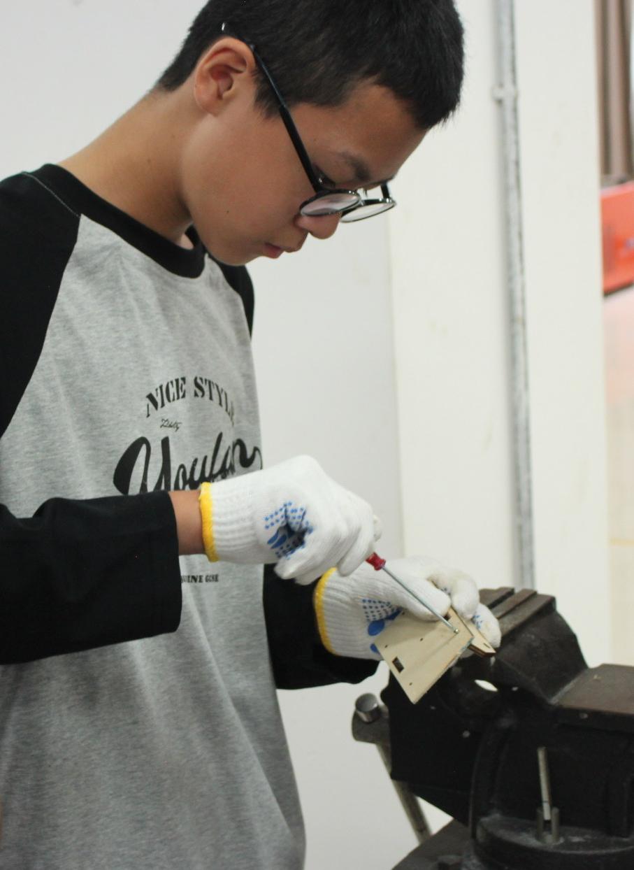 老师先讲解和示范木工工具的使用,木板的切割和拼装示意。课堂上,活动中,孩子们像小工匠,聚精会神地投入到木工制作中。有的孩子拿着锯子,在老师的指导下,一下一下拉着锯子将一块较大的木材锯成合适的尺寸;有的孩子亲自动手操作钻床,在木块上钻出小孔;还有的孩子非常细致用砂纸打磨成型的木块。经过孩子们不懈努力,木制坦克车终于问世。