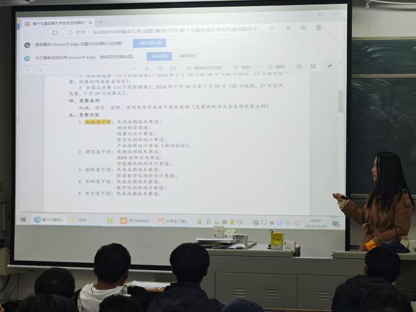 为让同学们了解学科竞赛相关内容,帮助同学们更好地做好竞赛规划,指导同学们高效备赛,为2025年pa娱乐游戏参加学科竞赛奠定坚实基础。12月19日-12月20日,公司组织机械学科竞赛负责老师在DB301阶梯教室讲解机械学科竞赛相关内容,2023级和2024级机械、机械闽台和车辆专业约80余名同学参加讲座。
